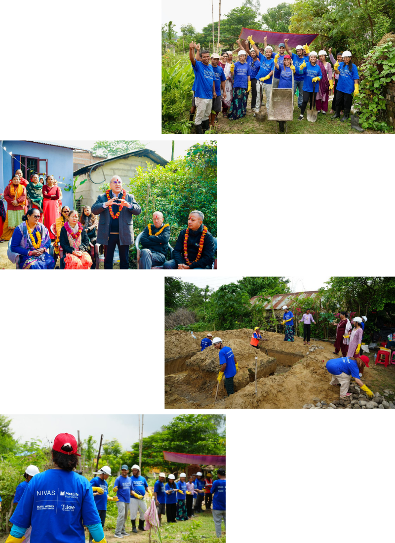 In September 2025, NIVAS partnered with MetLife Nepal to host a volunteer Build Day in Dang, bringing together local leaders, women construction trainees, municipal officials, and MetLife staff to begin construction for women-led families. Participants mixed cement, carried materials, and laid foundation stones alongside community members, transforming partnership into visible, shared action.